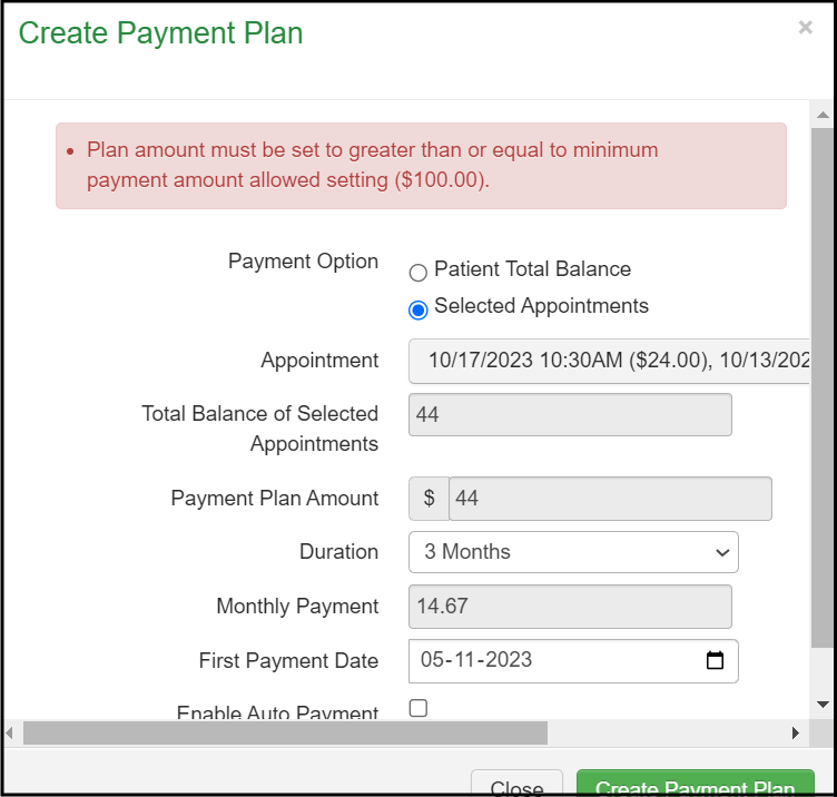 To set up the payment plan, either the minimum payment must be increased to the allowed setting, or the office administrator must update the setting to allow the payment plan to be saved.