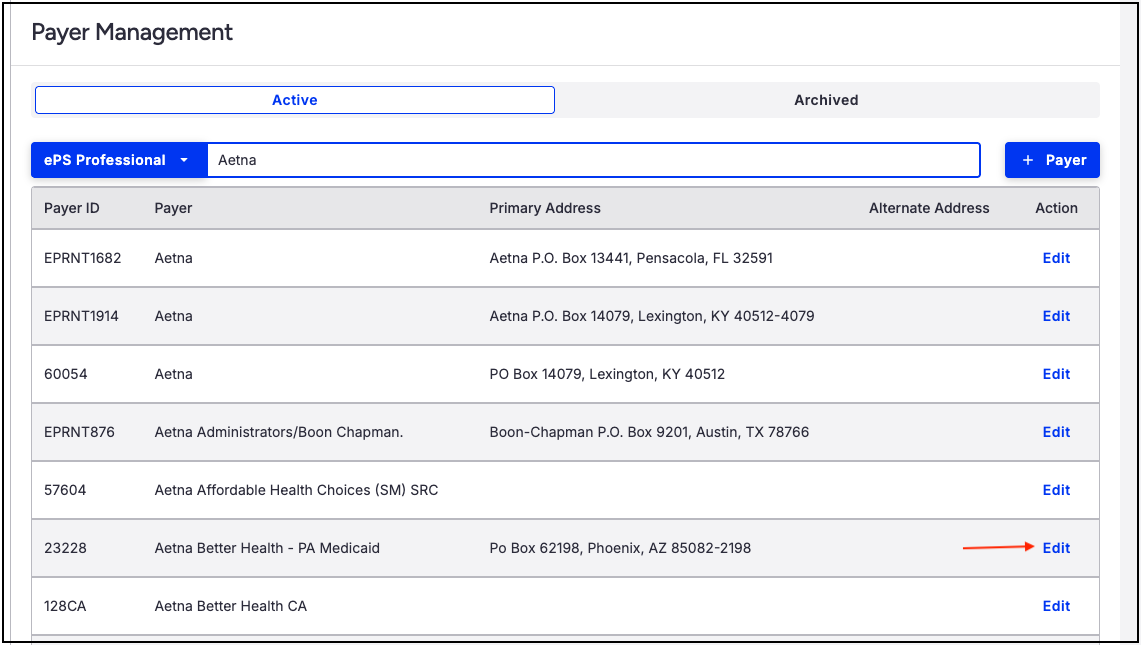 Please note - payers added this way will transmit to the payer via paper. The payer ID created through this method begins with PRNT, EPRNT, and HPRNT, all indicating the claim will be mailed to the payer.