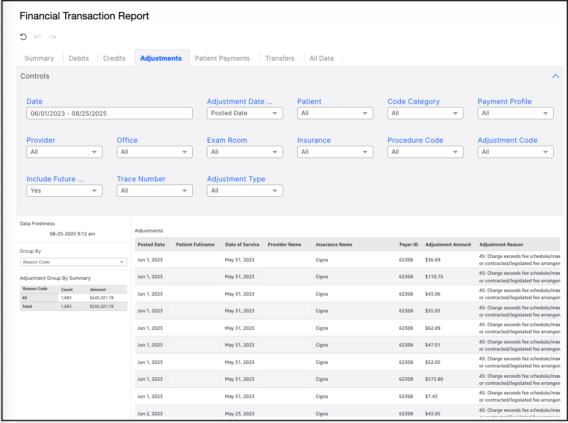 The fourth tab listed under the Financial Transactions (fka Day Sheet) is the Adjustments tab. Here is where you can see charges added for the parameters you set.