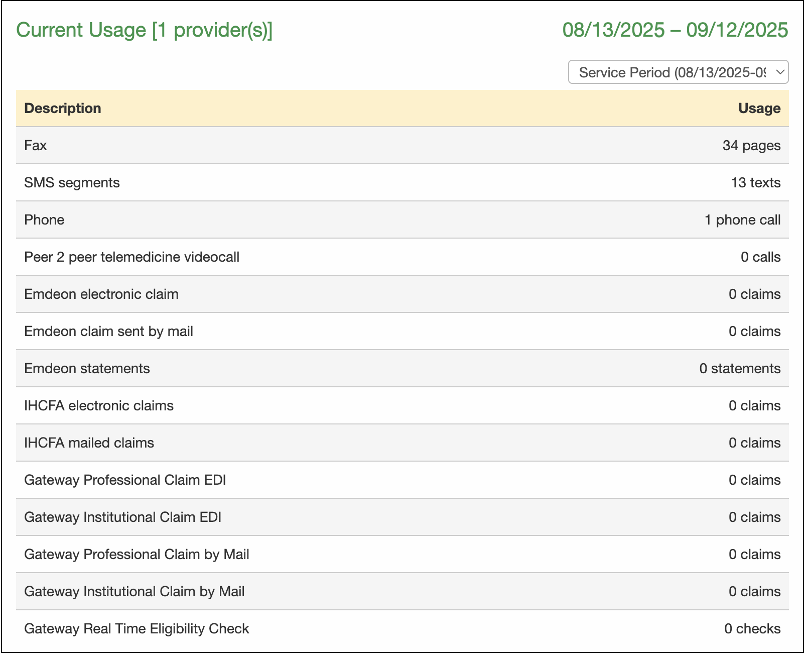 The Usage tab in Account Settings shows the number of faxes, text messages, video visits, and telephone reminders you sent during the usage period.