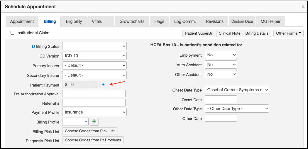 - Select the blue + symbol next to Patient Payment