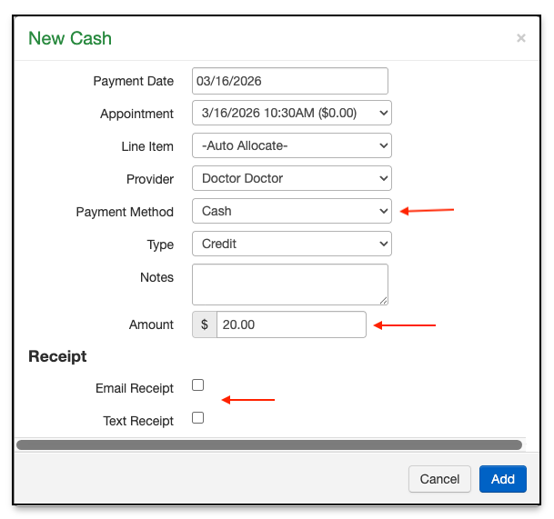 - The New Cash window will open. Fill in the payment method and the amount. Be sure to select email or text receipt.