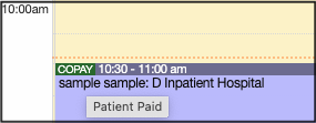 - Once saved, the word copay will appear on the daily calendar view next to the patient's appointment. If you hover over the word copay, a "patient paid" message will appear, confirming that the patient did pay their apointment copay.