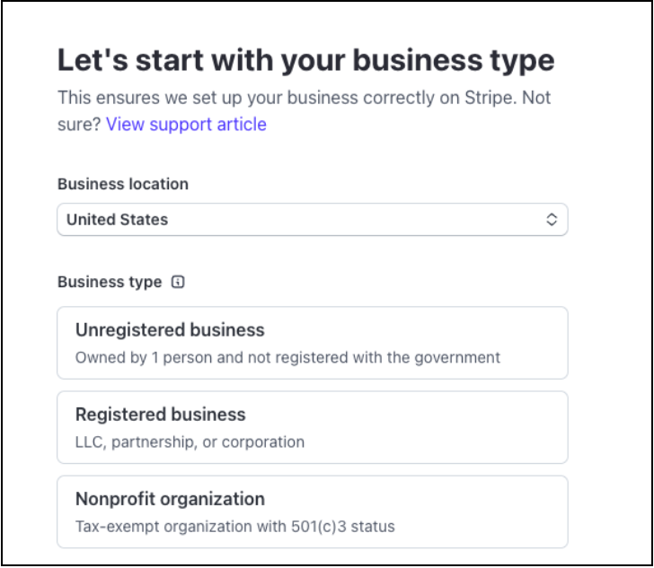 - A series of Stripe/financial screens will follow to set up banking information with Stripe.