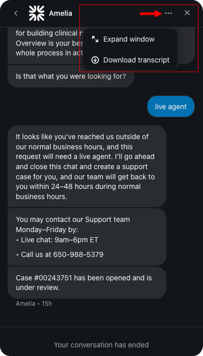 Open a message and select the three dots to expand the chat window or download a transcript.