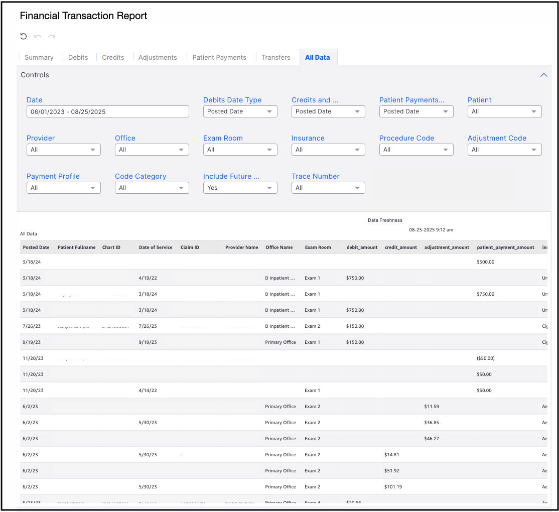 Here, you can view all the information corresponding to the parameters you set, including Debits, Credits, Adjustments, Patient Payments, and Transfers. You will need to scroll to the right to see some of the columns.