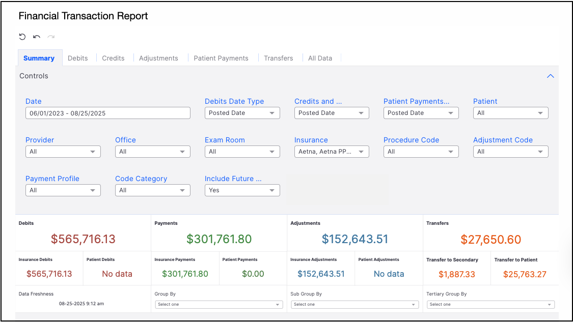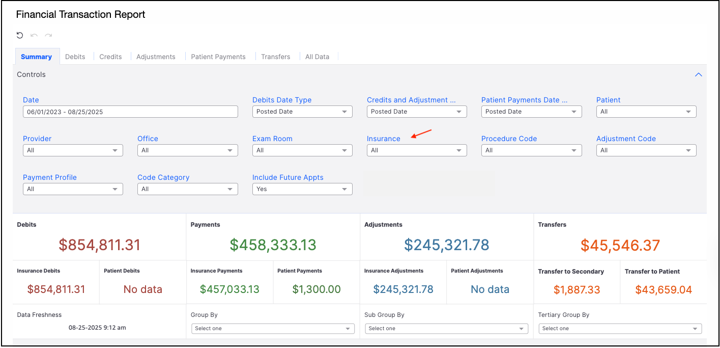 Included in the Financial Transactions report is the option to run a report for a specific insurance.