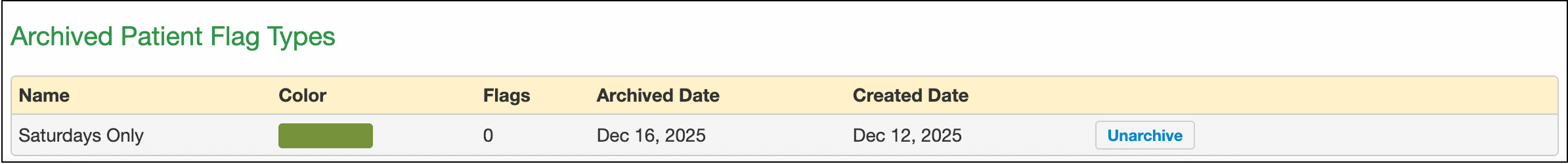 Under the Archived Patient Flag Types section, select Unarchive for the patient flag type you want to restore. The patient flag type moves to the Active Patient Flag Types section.