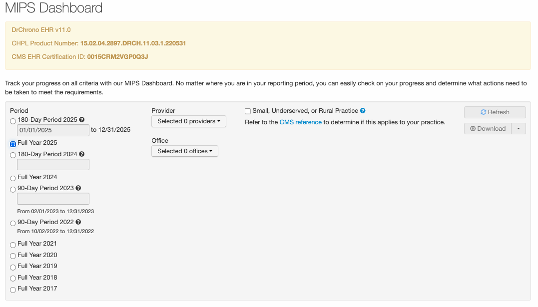 While DrChrono provides this report as a tool to assist with participation in MIPS, providers must still independently: (1) confirm that the underlying information was properly entered into DrChrono, (2) review all reporting information for its accuracy and applicability to their particular practice(s), and (3) retain documentation that supports the data reported for their participation in MIPS, as required by CMS retention policies.
