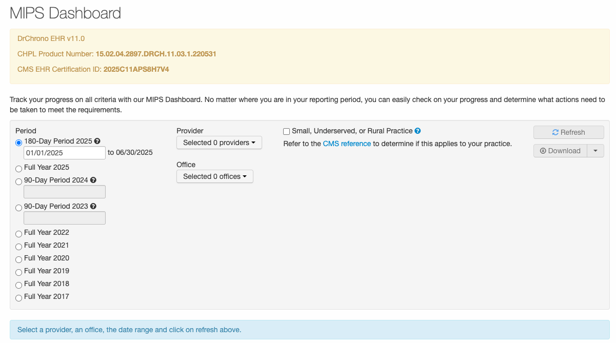 While DrChrono provides this report as a tool to assist with participation in MIPS, providers must still independently: (1) confirm that the underlying information was properly entered into DrChrono, (2) review all reporting information for its accuracy and applicability to their particular practice(s), and (3) retain documentation that supports the data reported for their participation in MIPS, as required by CMS retention policies.