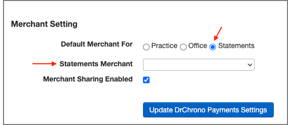 - Under Statement Merchant, use the drop-down to select the merchant ID that will receive the patient's payment. Please note that payment distribution across multiple Merchant IDs is not currently supported.