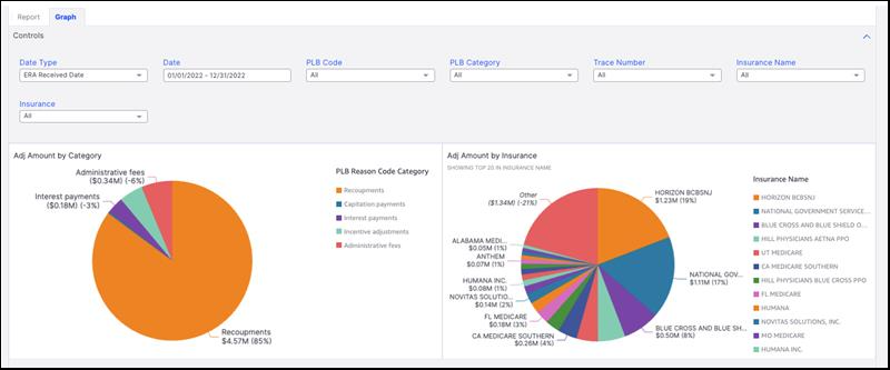 The graph tab will show the information in two pie charts: Adjustment Amount by Category and Adjustment Amount by Insurance.