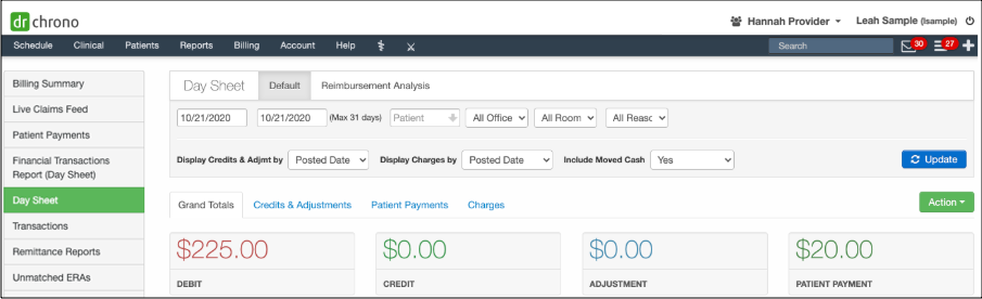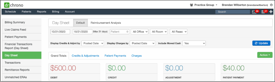 One primary use of the Practice Group option is to view reports for the entire practice. When you select Practice Group, you can view the totals for all providers. The following images show the Day Sheet for an individual provider and the practice group.