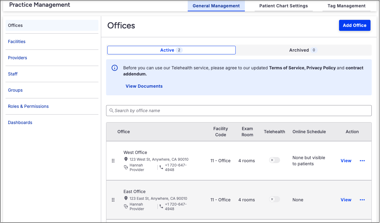 The Practice Management page comprises three tabs—General Management, Patient Chart Settings, and Tag Management.