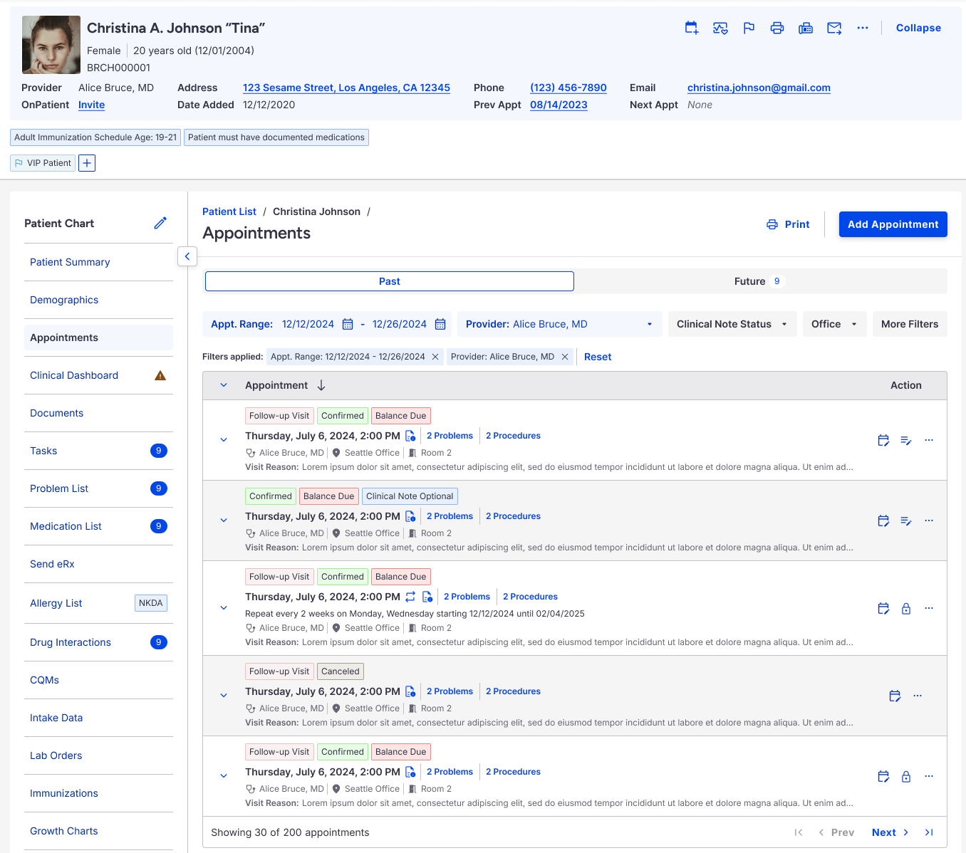 - Advanced filtering and search — Quickly locate past or future appointments by date range, provider, location, or clinical note status, without manually scrolling through lists