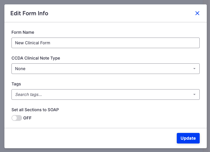 When creating a new clinical form, the Edit Form Info window will now open automatically. This allows users to quickly update the form name, CCDA Clinical Note Type, tags, and optionally set all sections to SOAP right away.