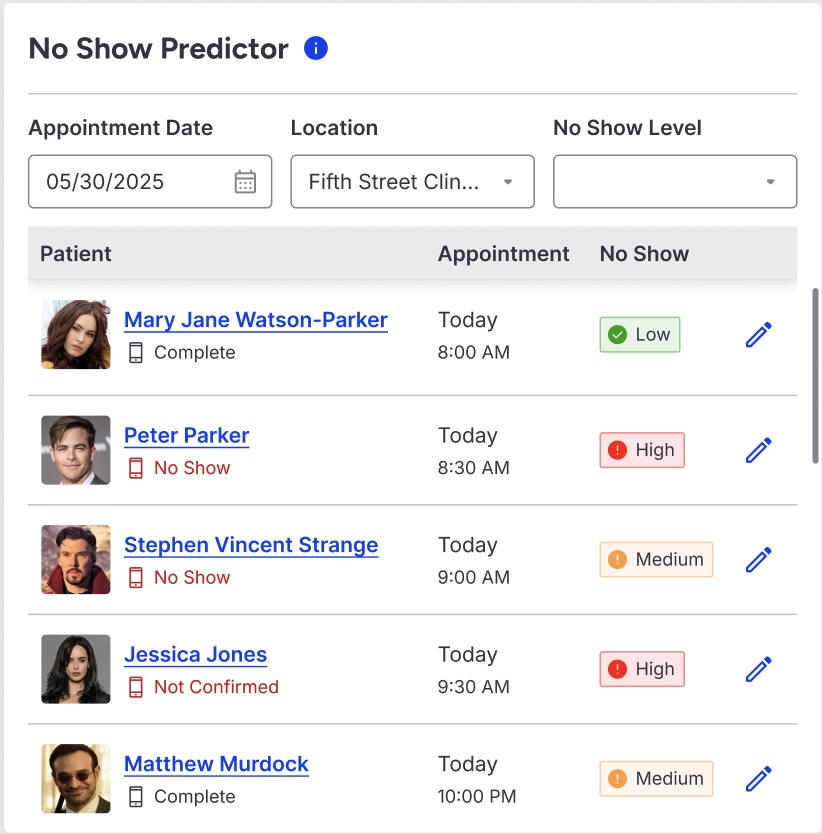 No Show Predictor uses AI-powered insights to assign a risk score to each upcoming appointment, helping your practice identify which visits are most likely to no-show. These scores are displayed directly in the No Show Predictor widget on the Dashboard, giving your team clear visibility and the opportunity to take proactive action before appointments are missed.