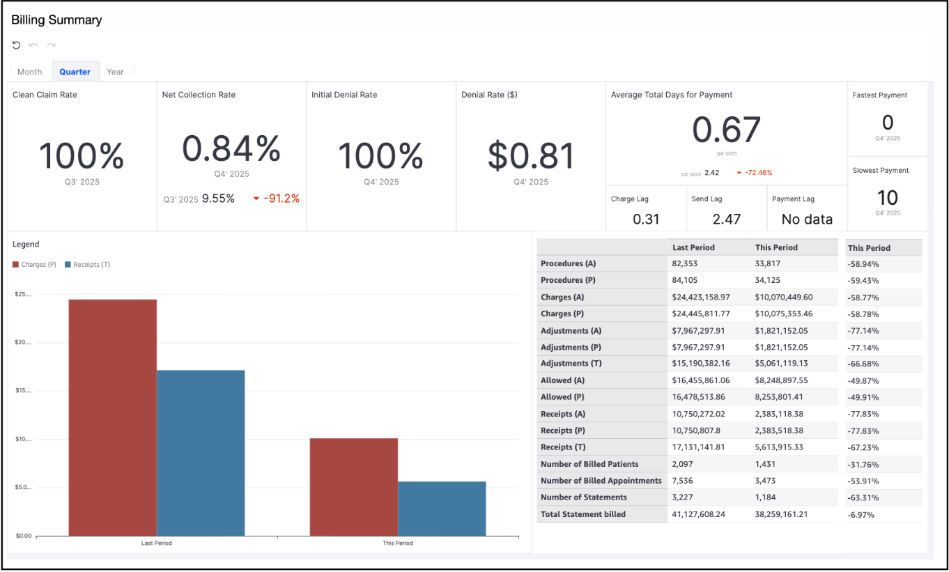 The Billing Summary report provides a clear overview of key performance metrics across monthly, quarterly, and yearly timeframes. It includes measures such as Clean Claim Rate, Net Collection Rate, Initial Denial Rate, Denial Rate (in dollars), Average Total Days for Payment, Charge Lag, Send Lag, and Payment Lag. A dynamic bar chart also allows you to compare charges and payments for the selected period.