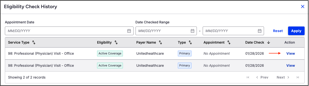 - The eligibility history window will open and show each eligibility check run for the patient. Filters for appointment date and date range are available if the list is long.