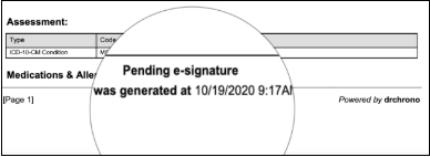 In the clinical note preview, the signature shows as pending e-signature at the bottom of the note until it is signed and locked.