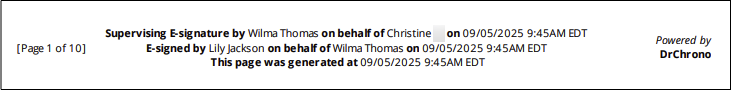 When supervising providers use the practice group dropdown to access a primary provider's account and sign and lock a clinical note on their behalf, the footer of the clinical note PDF indicates that the note was signed on behalf of that provider.