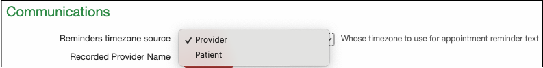 - In the Communications section, from the Reminder timezone source dropdown, select Provider or Patient. Provider is selected by default.